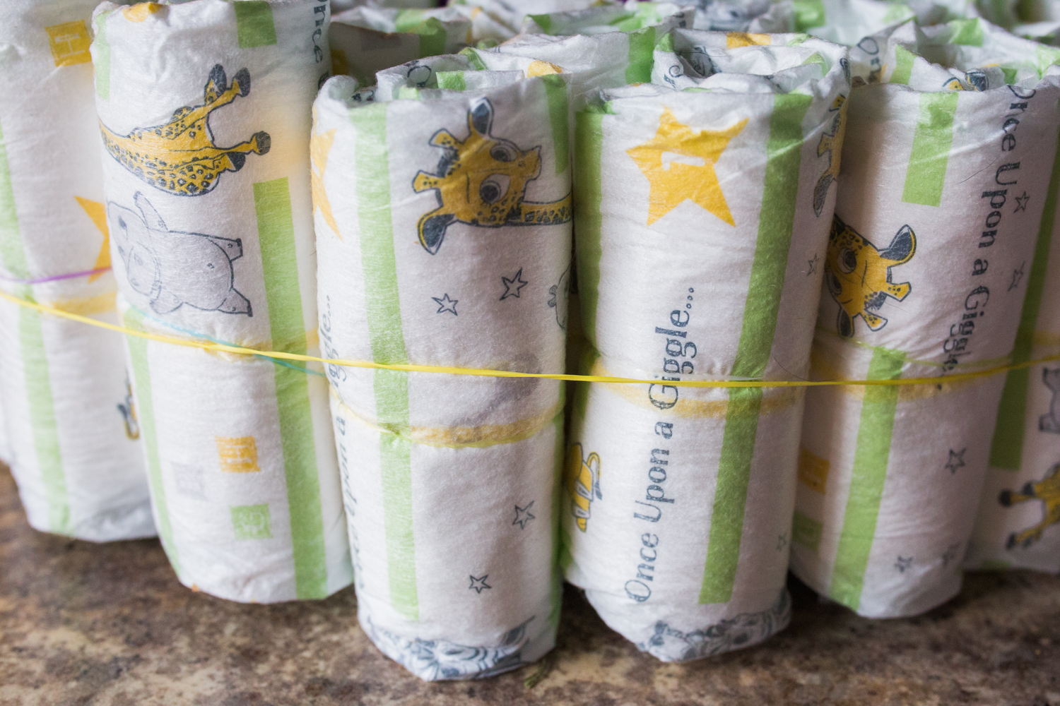 To make the diaper cake I used about 100 size 1 diapers. I rolled up each diaper and put a little girl rubber hair tie around it, though that step isn't necessarily required. I put a layer of rolled diapers around the formula container and held it in place with a regular rubberband. I kept adding layers until I felt it was big enough for a base.